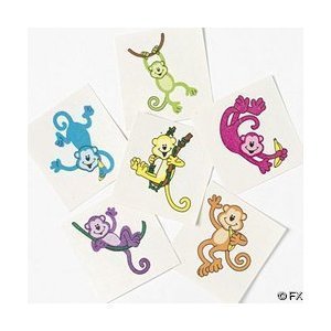 - Package contains 72 assorted monkey tattoos.