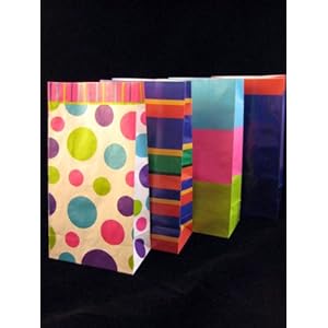 12 brightly colored sacks measure 5"W x 10"H x 3"D each. Contains 4 of each pattern shown.