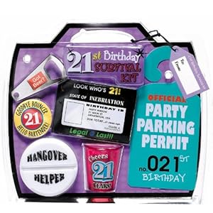 Prepare for your 21st birthday with our 21st Birthday Survival kit. Each kit includes an official 21st birthday parking permit, look who's 21 id card, 21st birthday shot glass, got beer can opener, 21st birthday button and hangover helper pill case.