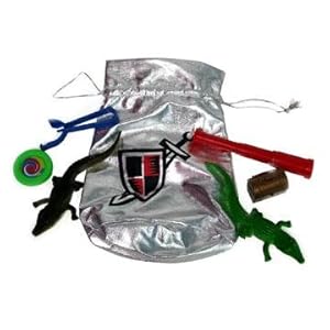 Knight Favor Bag Item Number: 41307 Share our new knight favor bags with party guests. Each silver metallic bag is printed with a sword and shield motif. Includes plastic toy alligators, toy horn, telescope, novelty toy and toy treasure chest. Note that color and novelty contents may vary slightly. Made in China. Age 3+