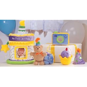 Gund My First Birthday Playset Whether your baby knows it or not, the Gund My First Birthday Playset is the gift they want this year. Your child's soft, confetti-colored birthday cake holds a 2 x 2 photo with their cute little face. Out of the self-storing, zippered cake pops out a tiny teddy bear that plays "Happy Birthday." The plush party hat and present crinkle, while the cupcake rattles. All that plus a squeaking camera with unbreakable mirror make this set a terrific sensory development toy. Order the Gund My First Birthday Playset today!