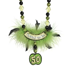 Tickled To Be 50 party bead necklaces are a great gift for that special birthday gal! The necklace is 30-inch in length. Colorful beads, hand painted resin, and feathers make these beads fun to wear and a memorable keepsake.